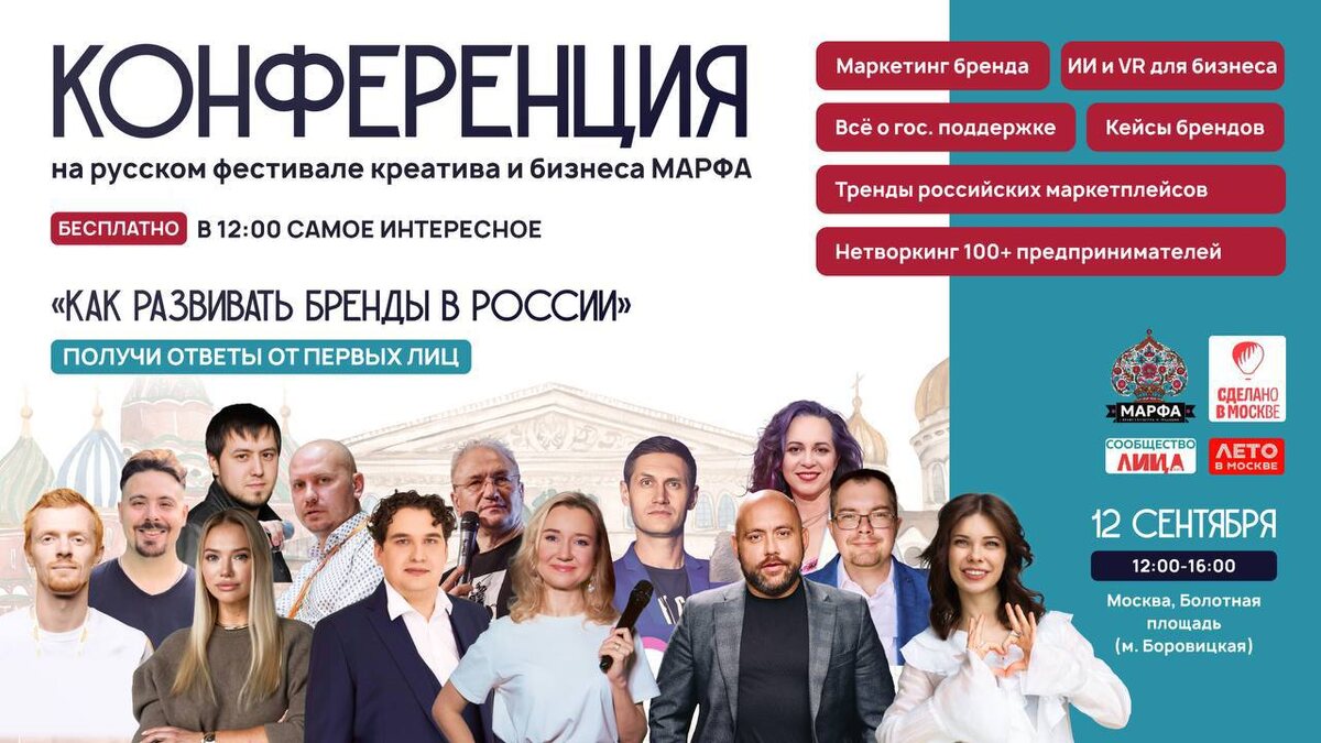 Как развивать бренд в России? 12 сентября с 12:00 по 16:00 будет проходить бесплатная конференция, где вы сможете узнать это от первых лиц. Спикеры: ↪️ТОП-эксперты e-commerce: Гала Гольдберг, Антон Ланцов, Владлен Строкань, Виктор Есин и другие. ↪️Основатели популярных российских проектов и брендов: - Семен Теняев (ТенЧат: популярный мессенджер с миллиардными оборотами) - Алексей Никонов (Brendoss: ТОП-10 на 6-ти маркетплейсах). ↪️Ведущие специалисты по ИИ и VR технологиям для бизнеса. Что будет: 🟤Выступления спикеров: ✅Как развивать рос.бренд в России, какие есть возможности и каналы сбыта ✅Практические кейсы по эффективному использованию ИИ и VR в бизнесе ✅Гос.поддержка: как получить и использовать. Кейсы, практика предпринимателей и порядок действий ✅Тренды маркетплейсов: куда идет развитие и как использовать возможности 🟤Организованный нетворкинг среди участников деловой программы 🟤Премия «Народный маркетплейс России» по результатам народного голосования 📆 Когда: 12 с