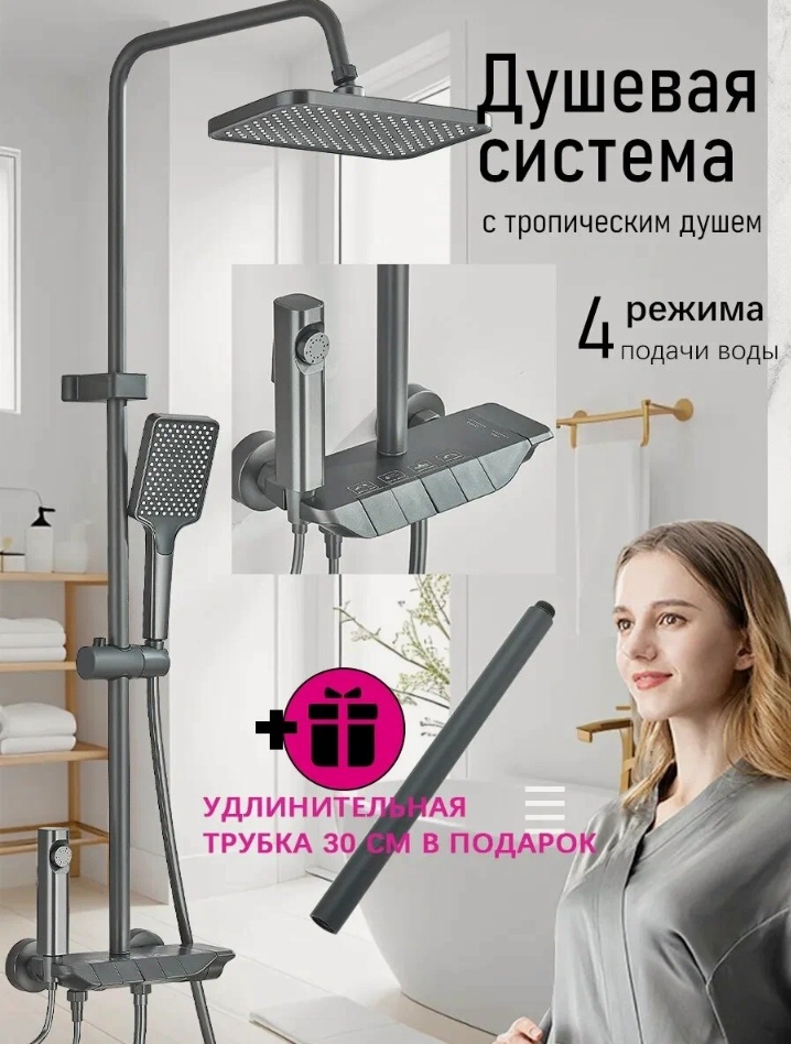 - Душевая система с тропическим душем для ванны и смесителем — это современное и удобное решение для создания уюта и комфорта в ванной комнате. Она сочетает в себе функциональность, эргономику и стильный дизайн, что делает процесс водных процедур более приятным и расслабляющим.