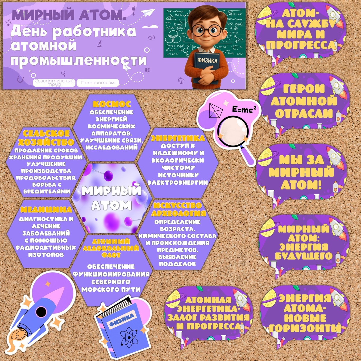 Набор можно использовать и для презентации. Подходит как украшение кабинета, школьной доски или информационного уголка для тематических классных часов и внеурочных занятий, посвященных теме атомной промышленности.