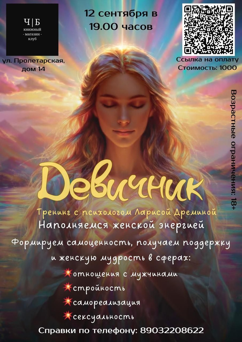 Уже завтра - 12 сентября в 19.00 часов - приглашаем в книжный магазин-клуб Ч|Б на тренинг в формате игры «Девичник». Его проводиь психолог Лариса Дремина. Участницы смогут проработать такие сферы женской психологии, как: 💥отношения с мужчинами 💥стройность 💥самореализация 💥сексуальность Бонус - подсказка метафорических карт Игра помогает прийти в ресурсное состояние: наполниться женской энергией, сформировать самоценность и получить поддержку и женскую мудрость. Подписывайтесь на НА КАНАЛ Девичника 18+ Стоимость: 1000 рублей. Оплатить можно по куар-коду на афише мероприятия или на сайте afisha.ru по ссылке: Справки по телефону: 89032208622 Адрес: улица Пролетарская, дом 14