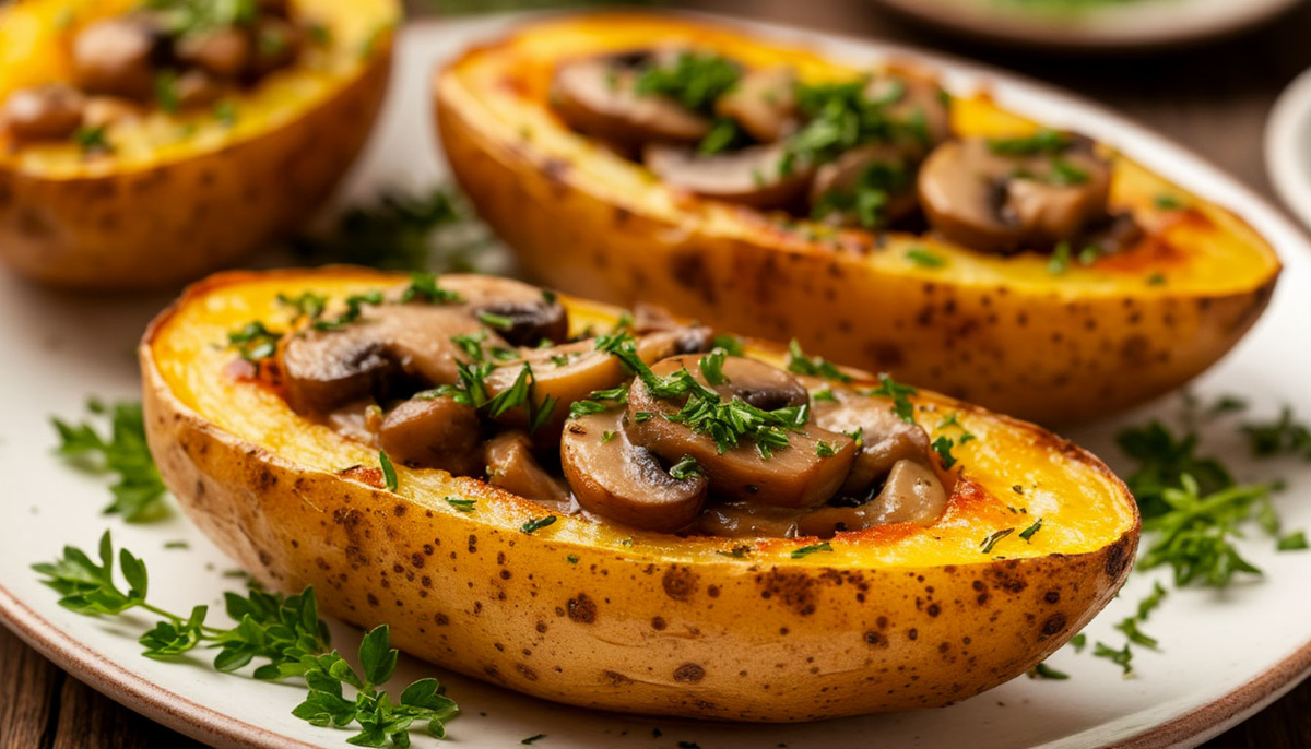 Соль, черный перец, паприка, сушеный орегано – по вкусу Картофель тщательно моем и разрезаем вдоль пополам. Чайной ложкой аккуратно вынимаем часть мякоти, формируя "лодочки". Смазываем лодочки изнутри оливковым маслом, солим и перчим. Лук и чеснок мелко нарезаем и обжариваем на оливковом масле до золотистого цвета. Грибы нарезаем пластинками и добавляем к луку. Обжариваем до готовности, посыпаем паприкой и орегано. Выкладываем грибную начинку в картофельные лодочки, сверху посыпаем измельченной свежей зеленью. Разогреваем духовку до 180°C. Запекаем лодочки 20-25 минут, до мягкости картофеля и золотистой корочки. Для еще боле