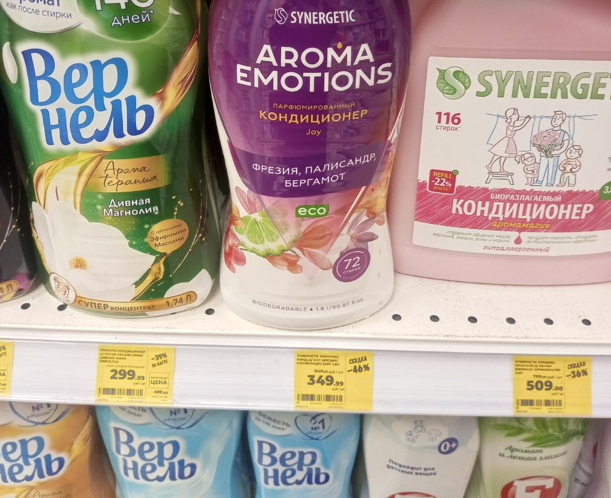 Тот редкий случай, когда "Synergetic" стал для меня восторгом, их новая линейка кондиционеров для стирки - это прям мое. Они выбрали шикарные ароматы, при этом они на долгое время остаются на одежде, а ткань вещей после стирки мягкая и легко гладится. Я знакома с этими новинками из маркетплейсов, но теперь и в оффлайн магазине можно приобрести, правда разница в цене все же ощутимо так присутствует. А еще на маркетплейсах есть разные ароматы, тут же только один.