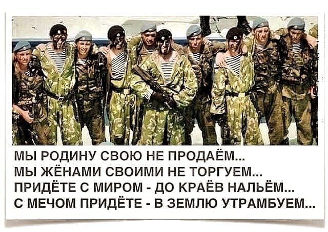 🇷🇺 🇷🇺 Мы Родину свою не продаём Мы любим мир, мы не хотим войны, Нам не страшны угрозы блока НАТО, Как Мать родную верные сыны, Храним страну заботливо и свято: «Мы Родину свою не продаём, Мы жёнами своими не торгуем, Придёте с миром – до краёв нальём, С мечом придёте – в землю утрамбуем!» Произносить не станем лишних слов, К чему в бою дешёвый пафос гордый, Ответ врагам всегда у нас готов, Лицом к лицу, решительно и твёрдо: «Мы Родину свою не продаём, Мы жёнами своими не торгуем, Придёте с миром – до краёв нальём, С мечом придёте – в землю утрамбуем!» Во все века святая наша Рать, Плечом к плечу, во всех тяжелых битвах, Россия Родина, Россия наша Мать Звучит и бьётся в сердце, как молитва: «Мы Родину свою не продаём, Мы жёнами своими не торгуем, Придёте с миром – до краёв нальём, С мечом придёте – в землю утрамбуем!» © Copyright: Григорий Петрович Васильев, 2010