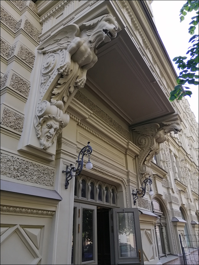 Наш дом мы видели позже с противоположной стороны — редкостной красоты здание, предоставившее нам возможность любоваться богатством архитектурных деталей, не скрытым реставрационным пологом. С мыслью о том, что мы всё же живём в роскошном доме, мы и входили впредь на металлические ступени через жутковатость реставрации.