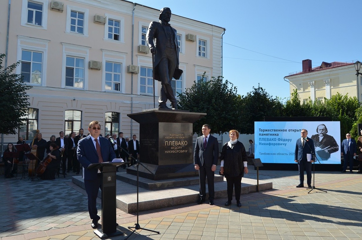 В Тамбове на улице Октябрьской открыли памятник выдающемуся российскому адвокату Федору Плевако. Скульптура установлена по инициативе Министерства юстиции РФ и адвокатов России в память о том, что Федор Никифорович несколько лет жил и работал в Тамбовской губернии. Образ создал скульптор Алексей Степаненко. Покрывало с памятника сняли министр юстиции Российской Федерации Константин Чуйченко, врио главы Тамбовской области Евгений Первышов, президент Федеральной палаты адвокатов РФ Светлана Володина. Почетными гостями праздника также стали известный российский адвокат Генри Резник и потомки Федора Плевако. Первыми цветы к подножию памятника возложили почетные гости, руководитель региона Евгений Первышов, председатель Тамбовской городской Думы Елена Леонова, глава администрации Тамбова Максим Косенков и другие официальные лица. Воздать почести легендарному предшественнику пришел весь цвет юридического сообщества региона. Подробнее – здесь. Подписаться на "Новости Тамбова" Предложит