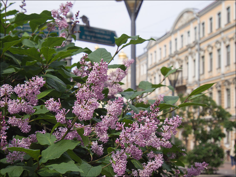 Да, к нашему удивлению, в середине июня на питерских улицах вовсю цвела сирень! Конечно, в основном это была поздняя сирень, такую ещё называют китайской. И аромат у неё совсем иной, непривычный — но сильный до невозможности! Даже если в зоне видимости цветущих кустов не наблюдалось — воздух всё равно был напоён этим густым ароматом. А ещё — тут было море цветущего шиповника, так что в симфонию сиреневых запахов иногда вплетались нежные розовые нотки.