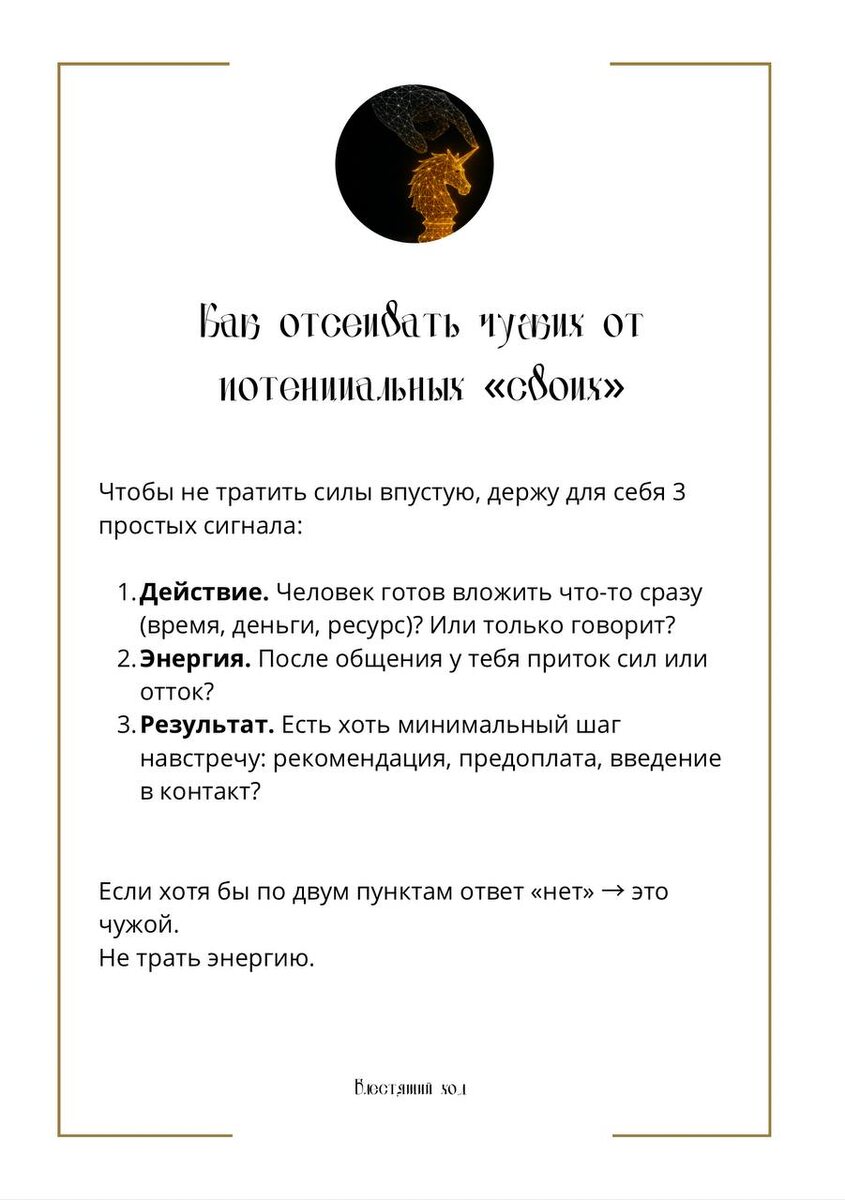 👉 О том, что «не принято говорить вслух» Недавно я понял одну вещь, которая перевернула моё отношение к людям и бизнесу. 🤔 Долгое время я жил в парадигме: «А вдруг чужой станет своим? Может, стоит помочь, подсказать, вложить время?» Я делился идеями, помогал просто так. Но чаще всего результат был один: человек исчезал, не возвращал ценность и точно не становился «своим». И вот что я осознал, благодаря старшему товарищу. Успешные люди мыслят бинарно: «свой» или «чужой». У неуспешных – есть третья зона: «вроде чужой, но вдруг когда-нибудь…». ⚠️ Именно в этой зоне сливаются силы, время и деньги. Теперь я принял решение: промежуточной зоны не существует. ✅ Либо человек «свой» – и мы строим вместе. ❌ Либо «чужой» – и всё общение только через правила. 📌 Чтобы не тратить силы впустую, я держу для себя 3 простых сигнала (смотри картинку ☝🏽).
