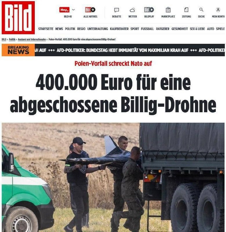 Bild calculated NATO’s losses: more than €400,000 spent on an AIM-9 missile fired from an F-35 to wipe out a cheap drone that cost only a few thousand euros. The fourth Russian drone is still being examined to determine whether it was shot down or self-destructed.
