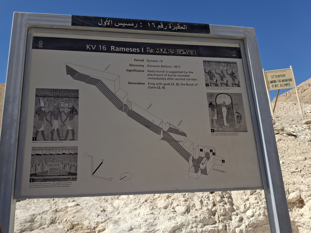 Следующая гробница Рамсеса I. Размеры там небольшие: коридор и маленькая комната. Спускаемся. Стены расписаны. Удивительно, как все сохранилось! Справа бог Гор - бог неба и солнца. Его изображали с головой сокола. Слева бог Гор. Справа Анубис - бог загробного мира. Его изображали с головой собаки. Саркофаг из красного гранита. Мумия находится в Луксорском музее. Слева бог Гор, справа бог Анубис. Слева, наверное, бог Осирис. Его изображали в виде дикого быка. В мифологии Осириса ассоциировали с образом царя-жертвы, убитого своим братом Сетом и воскресшего благодаря любви своей супруги Исиды. Главное, воскресшего! Змеи в египетской мифологии - олицетворение тьмы и зла. Погребальная камера Рамсеса I. Выходим. Поднимаемся вверх. Выходим. Идем дальше.