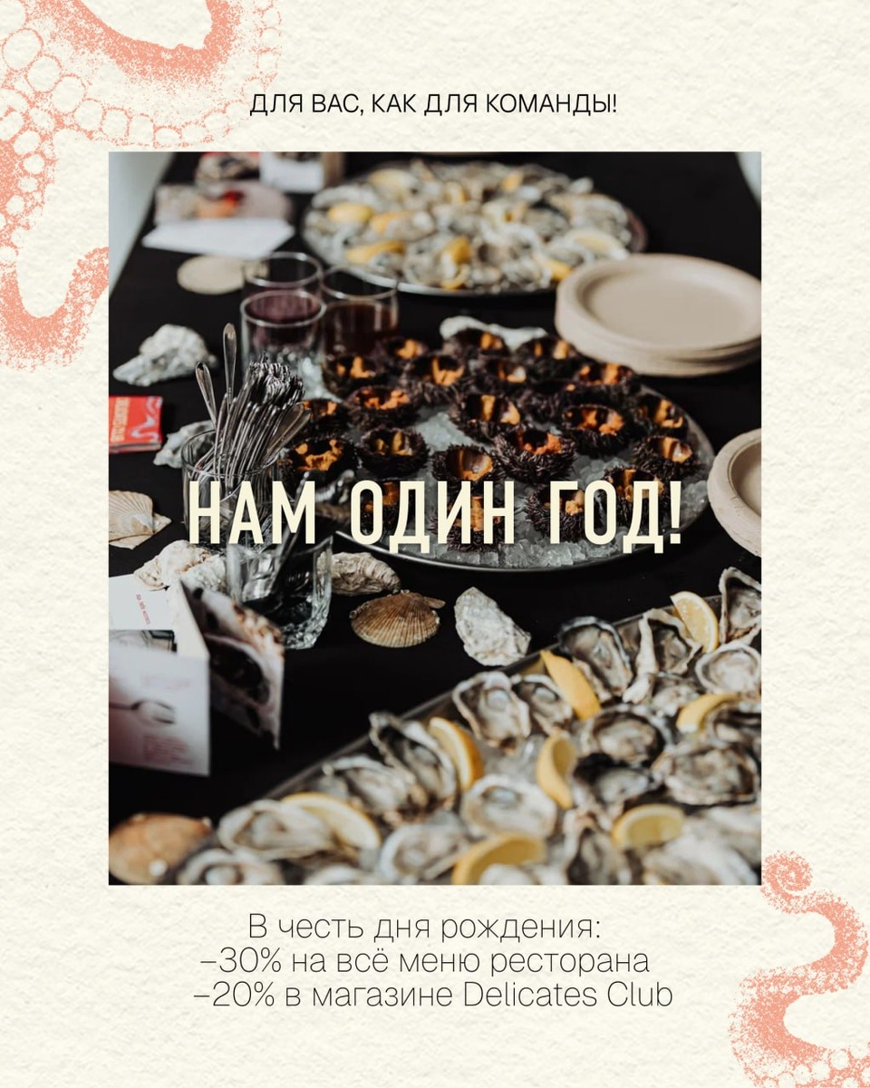 Нам 1 год! 🎂 Ровно год назад на Петровском проспекте открыл свои двери ресторан и магазин морепродуктов Delicates Club — и с тех пор каждый день мы делимся вкусом моря, свежестью и атмосферой с вами. Предлагаем провести этот день вместе! 🌊 Только 1 день, 13 сентября! ▫️ –30% на всё меню в ресторане ▫️ –20% в магазине на любые деликатесы Будет празднично, вкусно и как всегда — качественно. 📞 Бронь столов: +7 (812) 24-222-24 (доб. 2) 📍Петровский пр., 5 🐙 Delicates Club