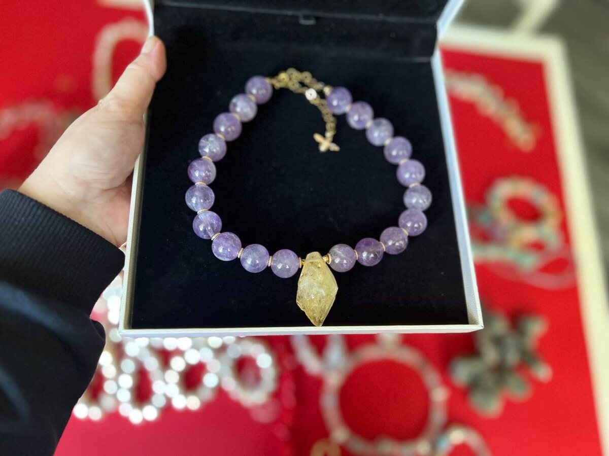Поэтому сделала чокер из полупрозрачного аметиста оттенка виноградников Соломона. И редкого кристалла медово-солнечного цитрина.