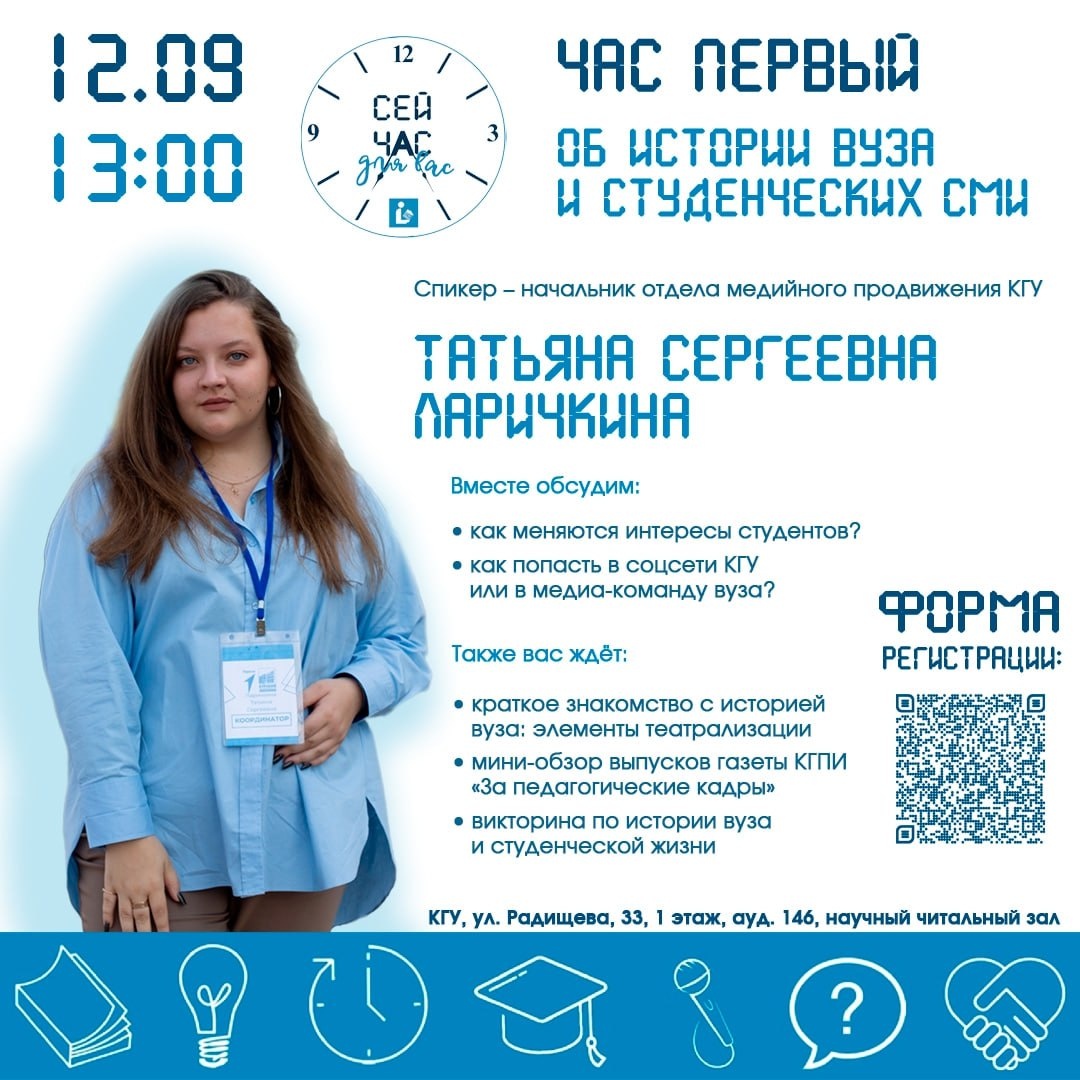 ЧАС первый💫 12 сентября в 13:00 КГУ, ул. Радищева, 33, Читальный зал (ауд. 146) Научная библиотека КГУ запускает новый проект «Сей ЧАС для вас». ЧАС первый, об истории вуза и студенческих СМИ, состоится уже завтра. Спикером выступит начальник отдела медийного продвижения КГУ Татьяна Сергеевна Ларичкина. ⏩Самое время готовить вопросы (за самый интересный можно получить приз) и регистрироваться на мероприятие по ссылке. До встречи на ЧАСе первом! ❤️ КГУ | Подписаться