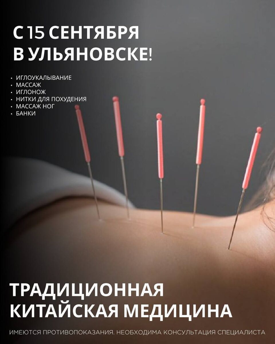 🌿 С 15 сентября в Ульяновске — традиционная китайская медицина! Восточные практики направлены на то, чтобы восстановить гармонию тела и души, запустить процессы самоисцеления и подарить лёгкость в теле. 📌 Вы сможете пройти: ✨ Иглоукалывание — помогает снять головные боли, стресс, бессонницу; — регулирует работу внутренних органов; — запускает естественные процессы восстановления организма. ✨ Массаж по китайским техникам — снимает мышечное напряжение, расслабляет; — улучшает кровообращение и подвижность суставов; — возвращает бодрость и силы. ✨ Иглнож — современная техника восточной медицины; — используется для снятия спазмов, улучшения подвижности мышц и суставов. ✨ Нитки для похудения — методика коррекции фигуры; — помогает ускорить метаболизм и активизировать процесс снижения веса. ✨ Массаж стоп — воздействие на биологически активные точки; — улучшает работу сердца, печени, желудка и других органов; — снимает усталость после долгого дня. ✨ Баночный массаж — помогает при пр