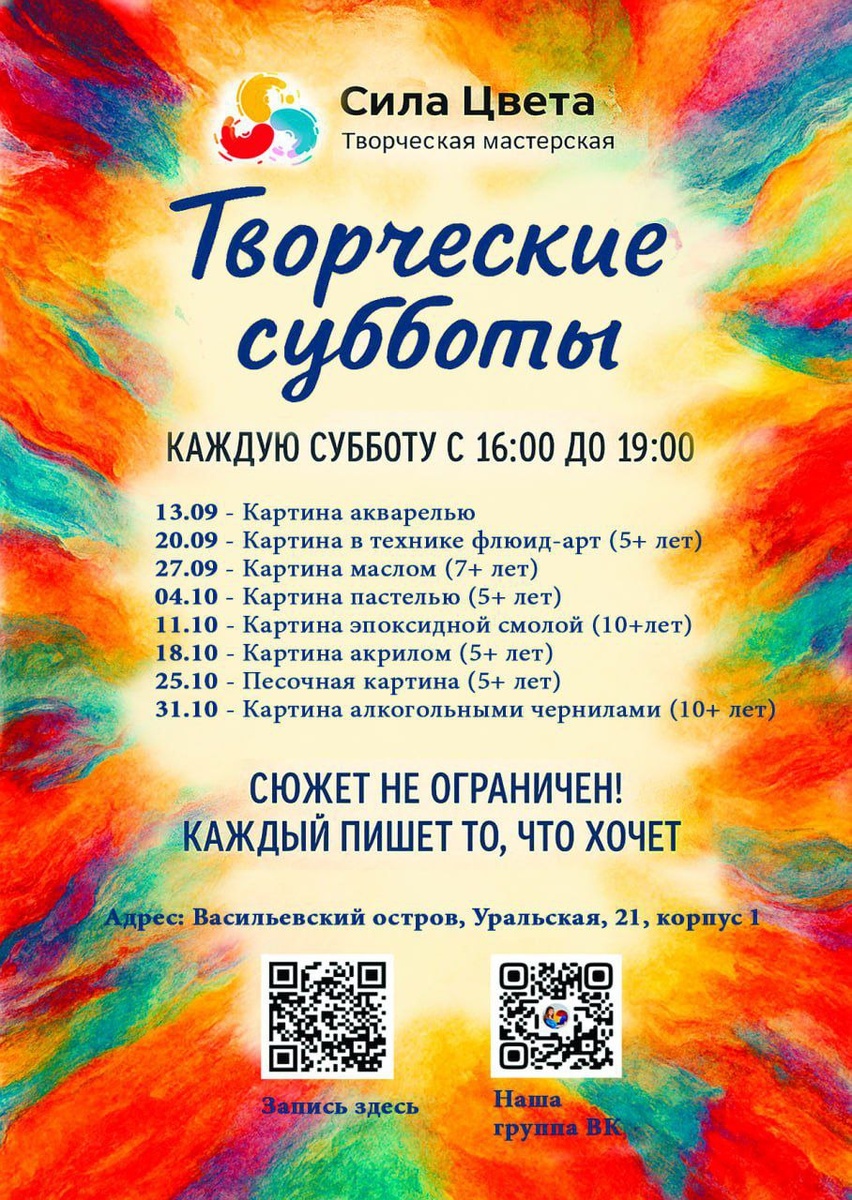 🎨 АНОНСИРУЕМ НОВЫЙ ФОРМАТ: ТВОРЧЕСКИЕ СУББОТЫ в «Силе Цвета»! Теперь по субботам (и в пятницу 31.10 😉) ждём всех, кто хочет пробовать новое, экспериментировать и открывать для себя разные грани искусства! 📅 Каждую субботу с 16:00 до 19:00 Мы будем знакомиться с разными техниками, материалами и стилями. От идеи до готовой работы — за одно занятие! ✨ Первая творческая суббота — уже 13 сентября! Пишем картину АКВАРЕЛЬЮ — нежную, воздушную и полную красок! Идеально для начала погружения в мир искусства. 💰 Форматы участия: ▪️ Для наших учеников — по вашему действующему абонементу (засчитывается как 1 занятие). ▪️ Для новых гостей — разовое посещение (стоимость зависит от материалов и темы). ▪️ НОВИНКА! Единый абонемент «Творческая суббота» — специально для творческих суббот! (Подробнее — https://vk.com/market/product/ediny-abonement-sila-masterstva-108517701-1304999) - 7 или 8 занятий — выгоднее, чем разовые посещения! - Действует только на занятия по субботам. - Важно: если пропуска