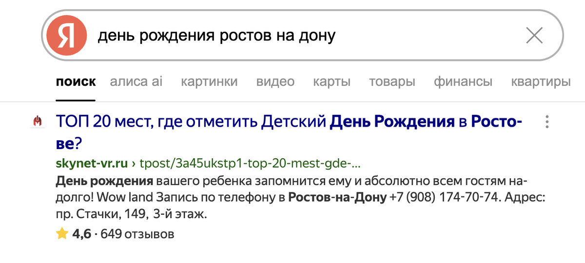 Статьи находятся в ТОПе поисковой выдаче по широким ключевым запросам («день рождения ребёнка в ростове», «день рождения в Ростове», «куда сходить в ростове», «развлечения в ростове», «праздник в ростове» и др.) - это обеспечивает долгосрочный поток заинтересованных потенциальных клиентов.