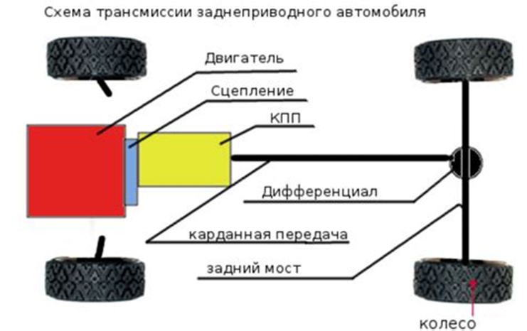 Трансмиссия — это система механизмов, которая передаёт крутящий момент от двигателя к ведущим колёсам и позволяет менять его величину и направление. Двигатель может вращаться со скоростью до 5000–6000 об/мин, а колёса — не более чем 1300 об/мин. То есть колёса вращаются в 4 раза медленнее, чем коленвал. При сложных дорожных условиях это соотношение ещё больше увеличивается. Трансмиссия даёт возможность не только регулировать скорость и мощность, но и маневрировать, останавливаться, двигаться задним ходом. Все эти функции обеспечиваются благодаря механизмам трансмиссии. Существуют три основные компоновки трансмиссии: заднеприводная (или классическая), переднеприводная и полноприводная. Трансмиссия заднеприводного автомобиля включает следующие компоненты: - Сцепление — позволяет временно отсоединить двигатель от трансмиссии и плавно включать передачи при трогании или переключении скоростей. - Коробка передач — меняет крутящий момент и передаёт его к колёсам, позволяет ехать задним ходом
