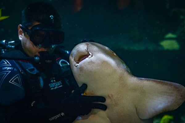 Каково это — погружаться в аквариум, где плавают огромных восемь акул? Правда ли, что память у рыб — всего несколько секунд? А когда подводные обитатели болеют, им делают уколы? Команда, которая строила, привозила экзотических рыб и вот уже 9 лет отвечает за работу панорамного аквариума в курском «Мегагринне», рассказала изданию «Друг для друга» об этом удивительном подводном мире. Настоящей звездой и негласным хозяином аквариума является групер по кличке Петрович. За свой яркий нрав он получил прозвище «местная полиция». Он контролирует всё происходящее: проверяет новых рыб и оборудование, следит за дайверами и с презрением отказывается от неаккуратно нарезанной еды. Как-то раз Петрович чуть не «уволил» стажера. Груперу новый человек по неизвестным причинам не понравился, и он начал агрессивно выталкивать его на поверхность. Пришлось срочно прервать погружение. А есть еще Ёжик – рыба-ёж, которая обожает играть и переворачиваться на руках у дайверов. Ёжик почти никогда не выходит из св