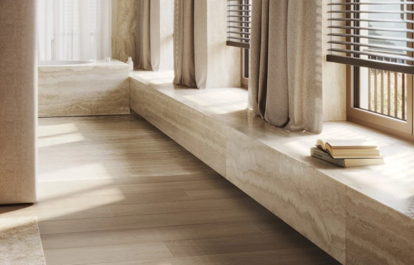 Современный минимализм, скандинавский стиль и джапанди: Здесь особенно востребованы серые и светло-бежевые сорта травертина (например, Travertine Silver или Silver Beige). Его тактильно приятная поверхность, лишенная броского глянца, идеально вписывается в эстетику сканди-минимализма, добавляя интерьеру глубины, текстуры и натуральности без визуальной перегруженности.
