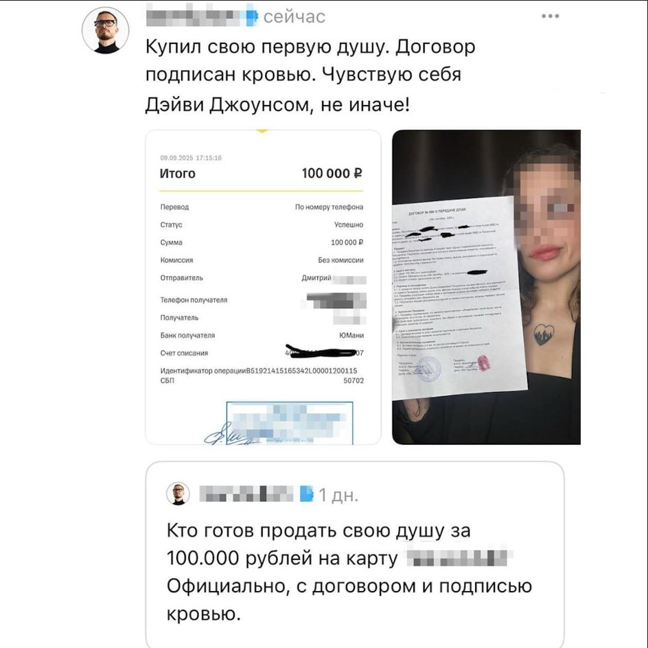 26 летняя москвичка по имени Карина стала героиней скандальной истории, продав свою душу за 100 тысяч рублей. Инициатором сделки выступил маркетолог Дмитрий, который изначально задумал это как розыгрыш ради хайпа. Однако ситуация вышла изпод контроля, когда Карина откликнулась на объявление и согласилась подписать договор. Сделка была оформлена официально — с подписями, печатями и даже каплей крови для "скрепления". Полученные деньги девушка спустила на коллекцию игрушек Лабубу, а остаток планирует потратить на билет на концерт Надежды Кадышевой. На вопрос о судьбе своей души Карина ответила равнодушно: "Мне всё равно. Теперь пусть новый владелец решает, что с ней делать". В Русской православной церкви (РПЦ) отнеслись к происшествию крайне серьёзно. Представители церкви заявили, что продажа души — это не просто фарс, а осознанный выбор зла. "Это не шуточки. Человек, который продал душу, фактически выбрал сторону тьмы. В будущем её ждут возможные моральные падения, болезни, страдания и
