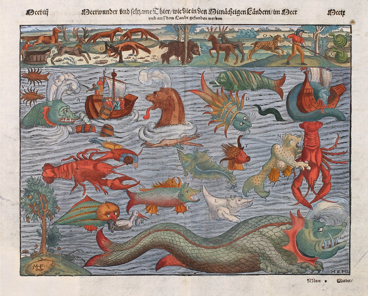 В мифах разных народов присутствуют легенды о морских чудовищах, монстрах, пожирающих неосторожных мореплавателей. Нередко изображения этих чудовищ (особенно часто гигантских осьминогов) можно встретить на древних картах. У большинства этих чудовищ были реальные прототипы: морские животные, которые могли отличаться от своих сородичей необычайно большим размером. Например, выделенный в отдельный вид гигантский осьминог в длину мог достигать трёх метров при весе до 50 килограммов. Свои морские чудовища существовали, разумеется, и в древности, задолго до появления людей. Одним из таковым, к примеру, был дунклеостей, пластинокожая рыба, существовавшая в палеозойскую эру, похожая на современную акулу. Примерное время существования дунклеостея охватывало девонский период; он жил приблизительно 420-360 миллионов лет назад и считался одним из самых крупных морских хищников палеозоя. К сожалению, на настоящий момент были обнаружены практически исключительно окаменелые останки черепа дунклеостея