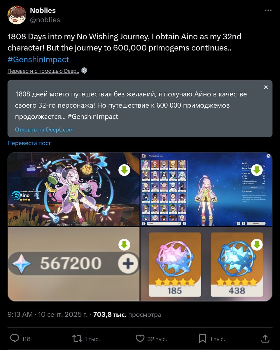 Гений целых 5 лет играет в Геншин, не потратив ни одного примогема. Он поделился тем, что собрал за это время: 567 тысяч примогемов; 438 обычных круток; 185 особенных круток; 32 персонажа. CtrlAltDelights- подписаться