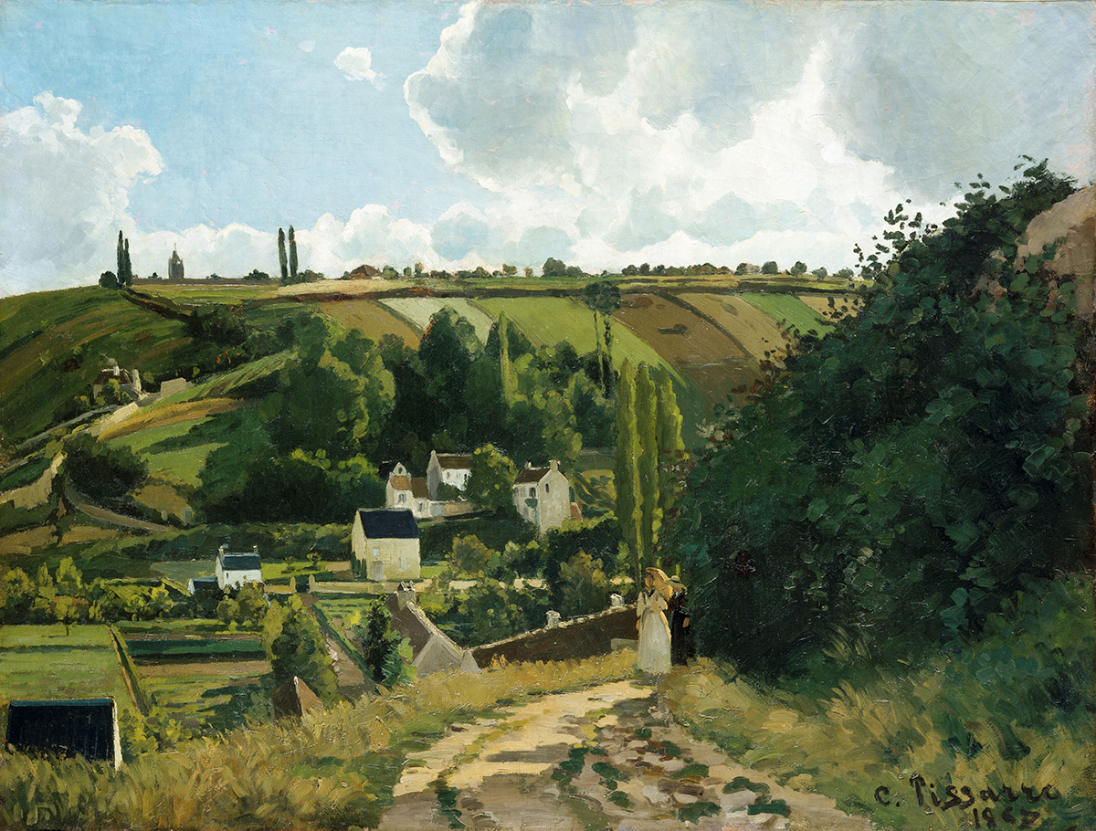 Написанная в период становления творческого стиля французского художника Камиль Писсарро (1830-1903), картина «Холм Жале, Понтуаз» (1867) представляет собой вид на деревню к северо-западу от Парижа. Две женщины находятся на полпути восхождения на холм, оставляя деревню позади себя. Небо, представляющее собой смесь синего и атмосферных облаков, позволяет художнику экспериментировать с тенями, отбрасываемыми на пейзаж. Писсарро был одним из первых, понявших, что тени никогда не были просто чёрными, а представляли собой сочетание окружающих цветов. Он был большим поклонником, нидерландского художника Яна Вермеера (1632–1675), творчество которого было практически забыто до недавнего открытия его заново в середине XIX века. Писсарро особенно ценил, как он использовал различные оттенки цветов на своих полотнах для показа теней. На картине «Холм Жале, Понтуаз» как раз хорошо видно, как художник тщательно прорабатывает тени. Это полотно помогло Писсарро закрепить репутацию новатора в изоб