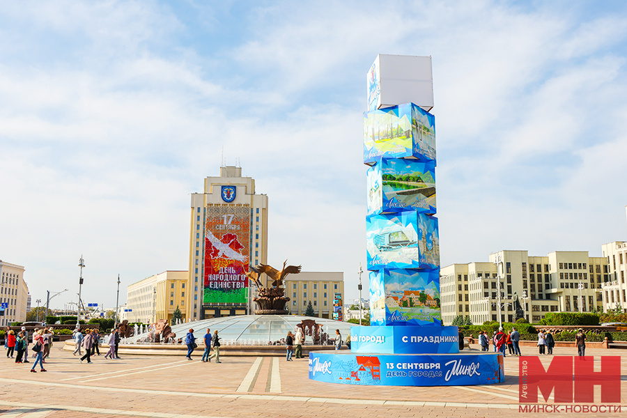 Колоритные арт-объекты, фигурные композиции, красочные баннеры и панно — столицу активно наряжают 11 сентября перед важными праздниками: Днем города и Днем народного единства, передает корреспондент агентства «Минск-Новости». Праздничный образ к грядущим выходным выдержан в оттенках синего с дополнением белоснежного и кирпично-красного цветов. Основной акцент графики — стилизованный фрагмент полотнища флага с отражением герба Минска, как отсылка к духовным корням города. — Благодаря необычному дизайнерскому решению создается иллюзия объема: будто полотно идет мягкой волной от дуновения ветра, — подчеркнула начальник отдела дизайна «Минскрекламы» Татьяна Бугоркова. — Дополняет картину надпись «Минск», выполненная лаконичным курсивом. Ярким элементом выступает абрис Троицкого предместья с узнаваемыми линиями и кирпично-красными крышами. Этот мотив размещен на многочисленных плакатах и рекламных стендах, установленных по всей столице, на объемных фигурных композициях и арт-объектах. Самый