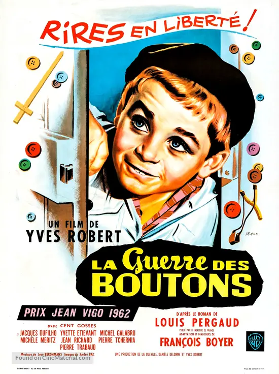 Война пуговиц / Пуговичная война / La guerre des boutons. Франция, 1962. Режиссер Ив Робер. Сценаристы: Ив Робер, Франсуа Буайе (по роману Луи Перго). Актеры: Андре Третон, Мартен Лартиг, Мишель Изелла, Даниель Жанно, Жан Ришар, Мишель Галабрю и др. Комедия. Премьера: 18.04.1962. Прокат во Франции: 4,1 млн. зрителей за первый год демонстрации (за все годы проката: 10,0 млн. зрителей).