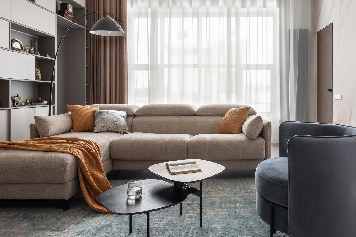 Потолки в гостиной увеличенной высоты — 4,8 м. Для этой комнаты была выбрана комбинация из монохромной бежево-серой гаммы и ярких оранжево-голубых акцентов. На одной из стен смонтировали фреску и 3D-панели, за которыми установили подсветку.