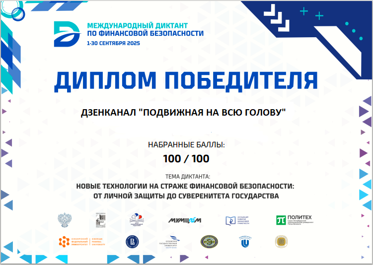 Доброго времени суток, гости и подписчики моего канала! С 1 сентября — 30 сентября проходит Международный диктант по финансовой безопасности. Заходим на сайт, нажимаем на кнопку "Начать диктант". На прохождение диктанта отводится 20 минут. В диктанте 20 вопросов, за каждый правильный ответ начисляется 5 баллов. Диктант можно пройти много раз. Свои ответы оставляю здесь. 1. Гонг правды: человеку задавали нейтральные и критические вопросы, он должен был тихо ударять в гонг, если звук удара становился громче, это считалось признаком волнения и лжи. 2. Бизнес прачечных самообслуживания. 3. Упоминания криптографии, шифров, секретных писем, кодов и их разгадки. 4. Виктор Люстиг. 5. Кодекс Хаммурапи, Вавилон. 6. Исаак Ньютон. 7. Генеративно-состязательные сети. 8. Создание фальшивой точки доступа с похожим названием. 9. Соединение с сайтом защищено, и данные передаются в зашифрованном виде. 10. Цифровая бухгалтерская книга, записи в которой хранятся на множестве компьютеров одновременно и