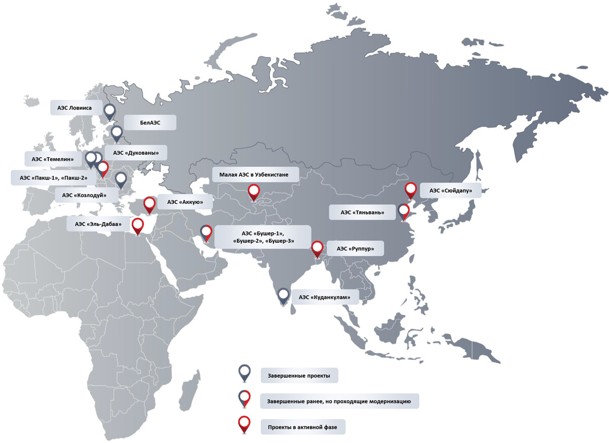 Чехия: АЭС «Дукованы» и «Темелин». В 1980-е годы на «Дукованах» ввели четыре блока ВВЭР-440. Позже на «Темелине» были построены два блока ВВЭР-1000, введённые в 2000 и 2002 годах. Этот проект подтвердил совместимость российской технологии с западными системами безопасности.
