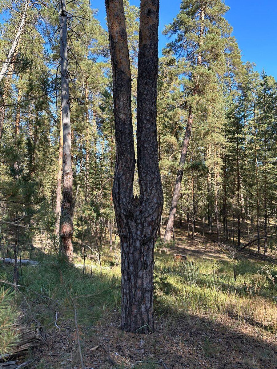 В Бузулукском бору растет сосна-акробат. После повреждения главного побега деревце не погибло, а выжило и стало сильнее, образовав редкую причудливую форму с двумя стволами.