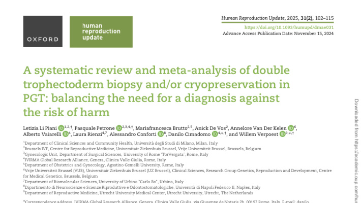 Ученые из Италии и Бельгии провели метаанализ и систематический обзор , опубликованный в журнале Human reproduction в 2025 году Li Piani L. at al.,2025 doi: 10.1093/humupd/dmae031. Чтобы предотвратить перенос эмбрионов, с моногенными заболеваниями и/или хромосомными дефектами, преимплантационное генетическое тестирование (ПГТ) требует биопсии трофэктодермы и криоконсервации. В 2–6% биопсий диагноз может быть неокончательным из-за неудачной амплификации ДНК или некачественных результатов. В этих случаях для получения генетического диагноза требуется размораживание эмбриона, повторная биопсия и повторной криоконсервация. Также если клиника ЭКО начинает предоставлять ПГТ и/или когда у пациенток появляются показания из-за множественных неудач, выкидышей или рождения больного ребенка после ЭКО, криоконсервированные непроверенные эмбрионы могут быть разморожены, биопсированы, а затем повторно витрифицированы. Однако до сих пор неясно, могут ли множественные манипуляции снизить репродуктив