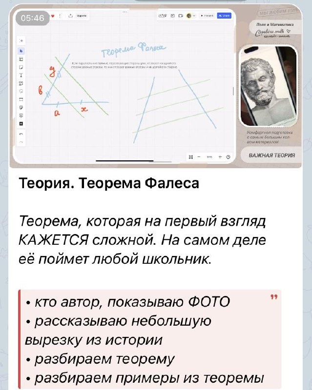сегодня подбирали материалы для тестов) вот, например, для теоремы Фалеса. Знаете такую??) 💞‼️ Тесты у нас выходят К КАЖДОМУ уроку по теории. От 10 до 100 вопросов (зависит от сложности темы). Это формат нашумевшего ПЕРЕВЕРНУТОГО класса ⚡️🔥 ЗАПИСАТЬСЯ НА ГОДОВОЙ ЕГЭ БАЗА ИЛИ ПРОФИЛЬ-2026 100% возврат если что-то не понравится 110% материалов, основанных на ФПУ и ФИПИ я — эксперт ЕГЭ и автор учебников
