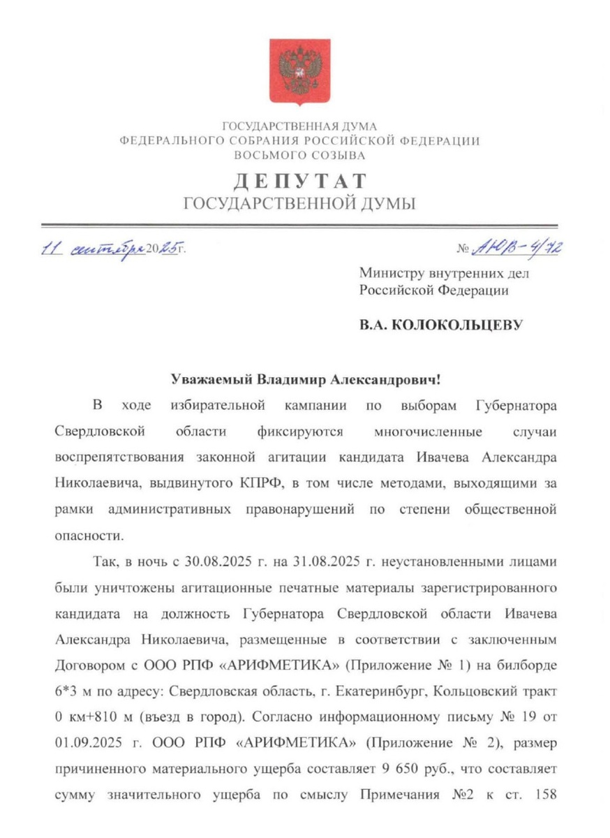 Направил в связи с этим обращение министру внутренних дел России Владимиру Колокольцеву. Факты таковы: - Банды нанятых кем-то мордоворотов неоднократно пытались запугивать и отбирать газеты и листовки у агитаторов нашего кандидата Александра Ивачёва. При этом у одного из агитаторов разбили стекло личного автомобиля. - Ночью в Екатеринбурге неизвестными были срезаны агитационные баннеры нашего кандидата. Нанесён значительный материальный ущерб. - Порча агитационных материалов Ивачёва приобрела массовый характер. - В интернете усиленно разгоняются фейковые видеролики, направленные на дискредитацию кандидата-коммуниста. Например, ролик, в котором некий человек в накидке с эмблемой КПРФ раздаёт завсегдатаям алкомаркета прямо у входа в магазин предвыборную агитацию Ивачёва, а получившие буклеты люди заявляют в камеру, что им «пообещали либо деньги, либо скидку на алкоголь». Конечно, в кадре не видно ни одного лица, да и в целом происходящее выглядит совершенно бредовым. Причём такому пресс