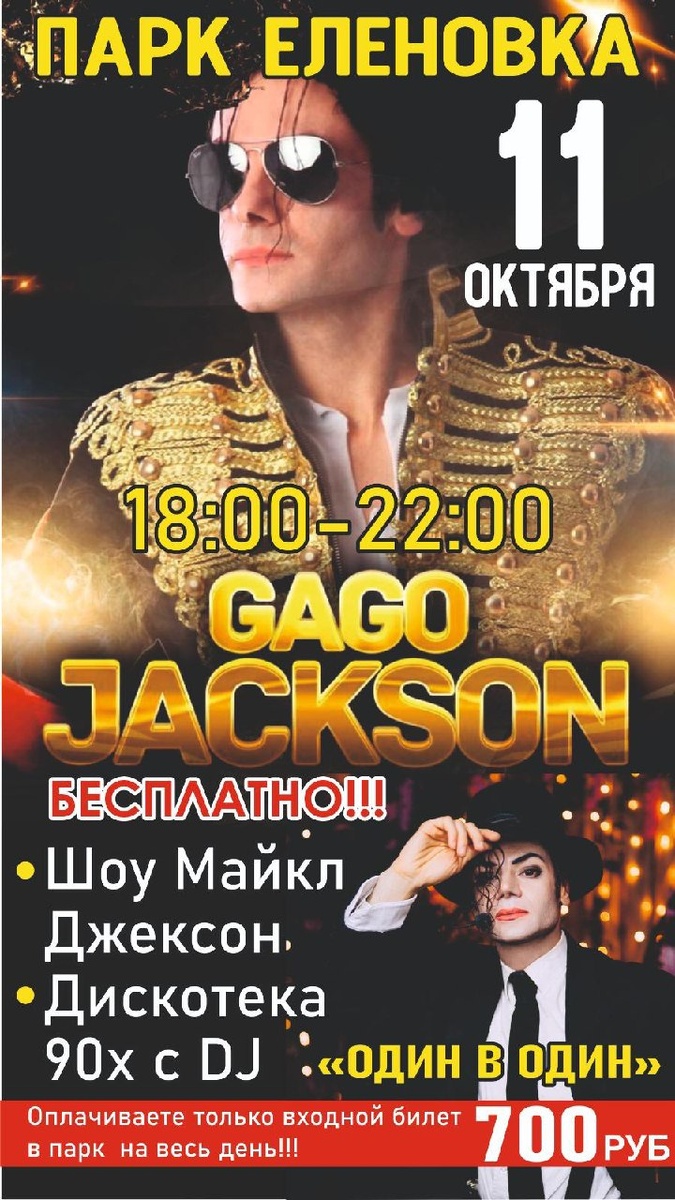 🌟 Впервые в Еленовке! 🌟 Профессиональный двойник Майкла Джексона — GAGO JACKSON! 🎉 Победитель международного гала-шоу “Минута Славы”, 🎉 Финалист российского проекта “Минута Славы”. Приезжайте и окунитесь в атмосферу легендарного Короля поп-музыки! 💃 Кроме того, вас ждёт дискотека 90-х с DJ — зажигаем вместе! 🕺 📆 Дата: 11 октября 🕘 Начало: 18:00-22:00 👉 Вход БЕСПЛАТНЫЙ при покупке входного билета в парк, информация о цене на сайте elenovka.ru Не пропустите! 🔥