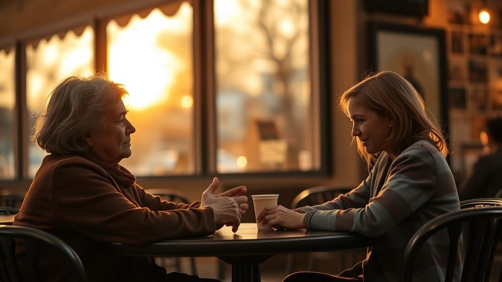 Они говорили долго — о страхах, об одиночестве, о том, что раньше не решались произнести вслух. В какой-то момент обе засмеялись сквозь слёзы; напряжение растворилось среди голосов посетителей кафе.