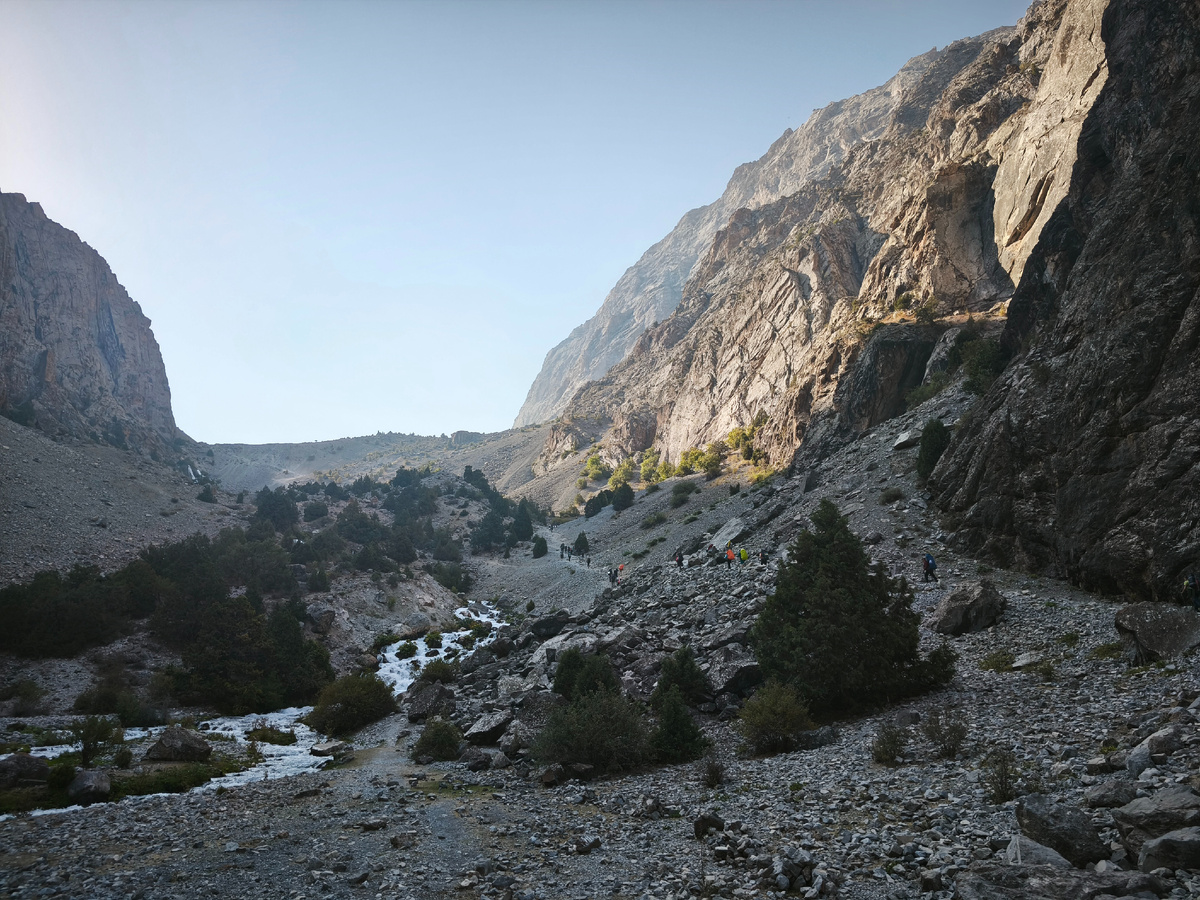 Тут появляется ослик! Не, ну, конечно, он был с погонщиком (фото от Руслана ниже). Пара туристов шла рядом налегке. но выяснилось, что они тут по делу. Проводится какой-то супердлинный забег на неделю, если не больше.. По горам, с набором высот... Участников не так много (не то чтобы удивительно!). И маршрут пролегает в том числе по этой тропе. И задача этих парней - маркировать маршрут забега. Река Артуч где-то очень низко осталась... Идём дальше Простоооор! И снежные вершины!!! Площадка прям для фотосессий. Вот не хватает макета "Я люблю Фаны" Фотосессия тут была большая. С очередью на фото!
