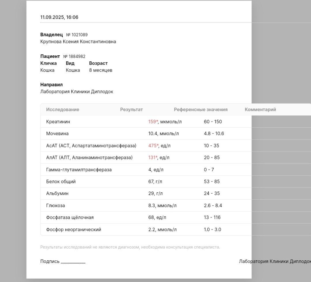 https://dzen.ru/media/hulkoxvostiki/k-sojaleniiu-ostatsia-v-storone-ne-poluchilos-68c299611788e42a7b217217 Пока у нас нет конкретной информации, только результаты анализов. Кошку оставили на диагностику в стационаре (оранжевый — не знаю, что это значит). Стоимость стационара — 12 тысяч рублей. Водитель возвращается домой, он внёс аванс в 20 тысяч рублей + дорога и ожидание — я перевела эти деньги. Ждём звонка из «Диплодок». Спасибо огромное всем за помощь. ❤️