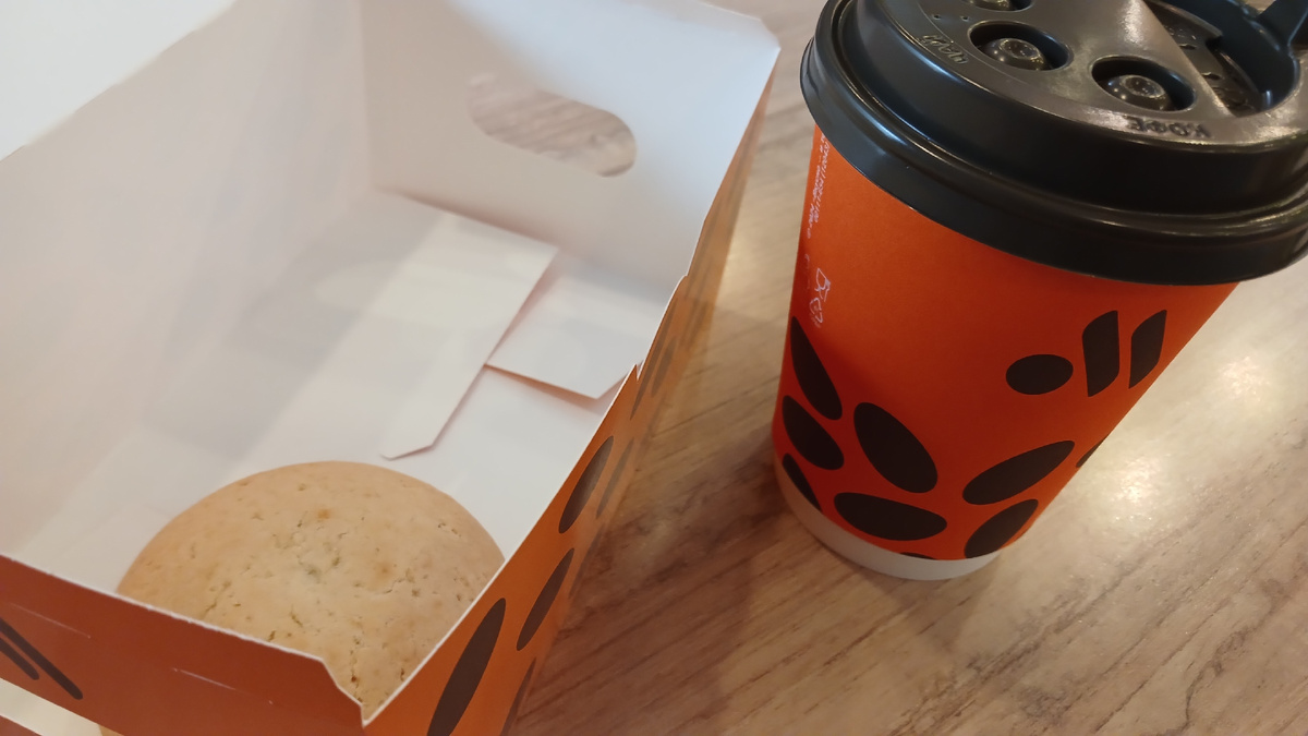 Пока ждали его, зашли со старшим в "Точку" выпить по кофе. Я себе по купону взяла кофе и творожник. Довольно вкусная выпечка типа сочника.