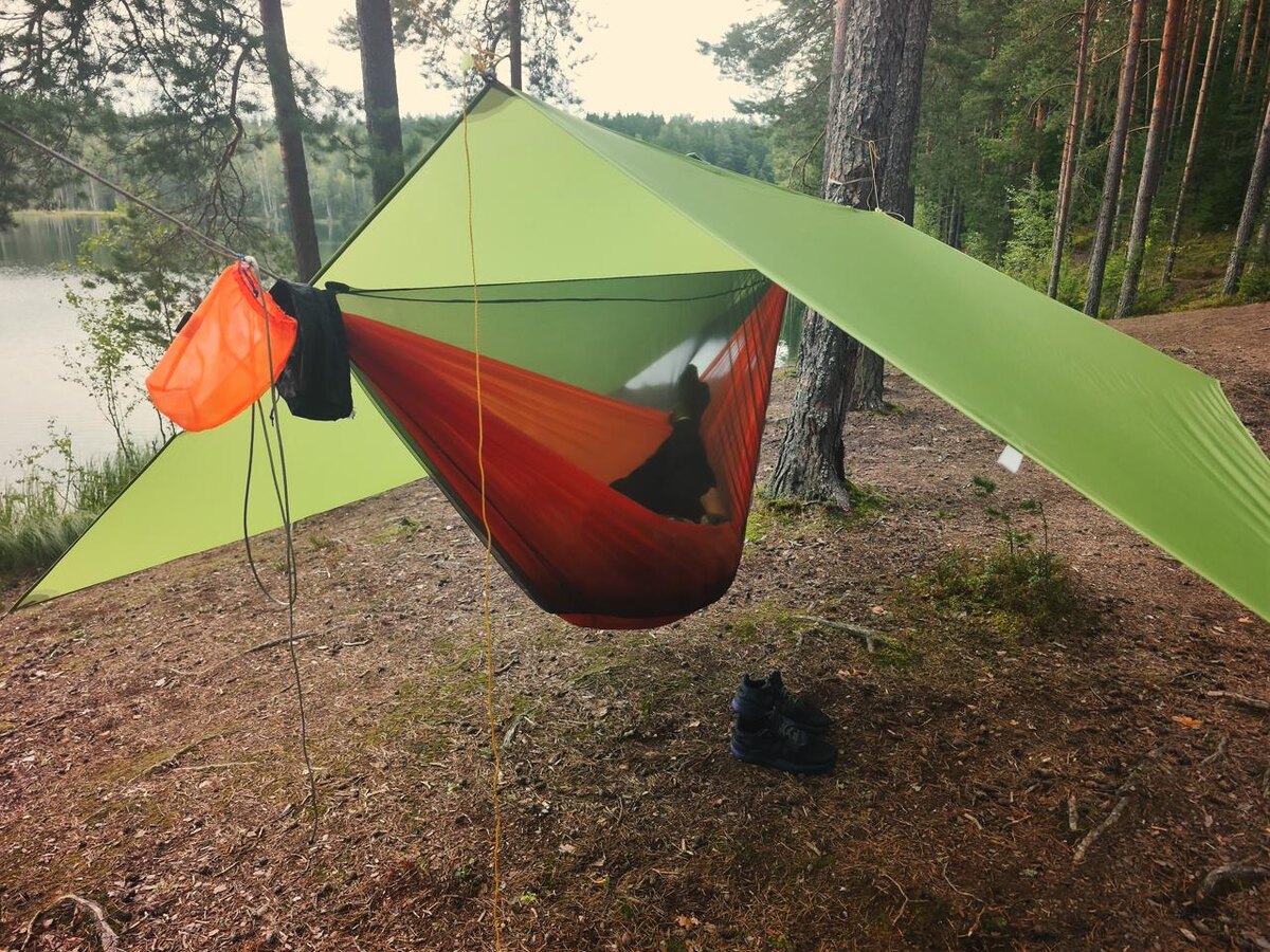 На выходных впервые тестировали парковый гамак с новинкой от Cradle - съёмной москитной сеткой LiteNet. Как раз наш выход попал на не самый благоприятный сезон нашествия лосиных мух - те, кто сталкивался с ними в лесу, понимают, насколько это может испортить любой отдых. Фишка давольно простая и гениальная: сетка надевается сверху гамака на риджлайн, снизу утягивается резинкой - и всё, ты надёжно спрятан внутри. Днём её легко можно сдвинуть к краю и наслаждаться более «открытым форматом» образовав окошко сбоку. А когда поднимается гнус - снова перевернуть окошком вниз, и ты в безопасности. LiteNet сделана из облегчённой версии фирменной сетки AntiMidge, с которой я уже знаком по гамаку Trail Long. Хочу отдельно отметить, что новая версия сетки очень приятная тактильно, но возможно со временем будет менее устойчива к зацепам. Чёрный цвет даёт приятный «матовый эффект» - всё вокруг видно, но при этом сам будто за стеклом. Совместимость с андерквилтом Serenity - без всяких компромиссов,