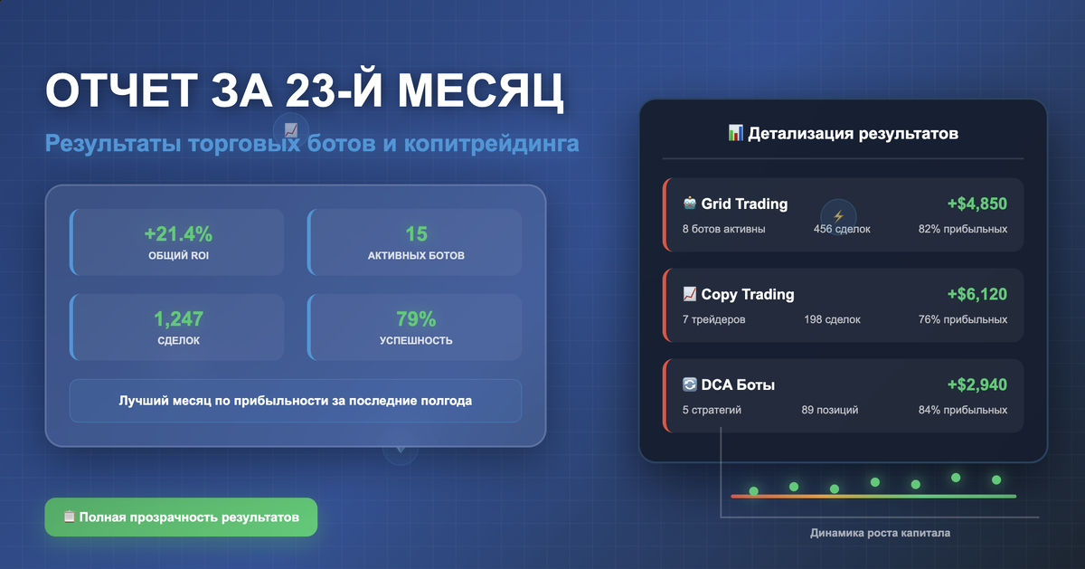 Вот уже 23 месяца подряд я делюсь с вами всеми прибылями и убытками от торговых ботов, которые у меня работают. Также рассказываю о других финансовых результатах, включая фондовый рынок — по крайней мере, о тех, которыми могу поделиться публично.