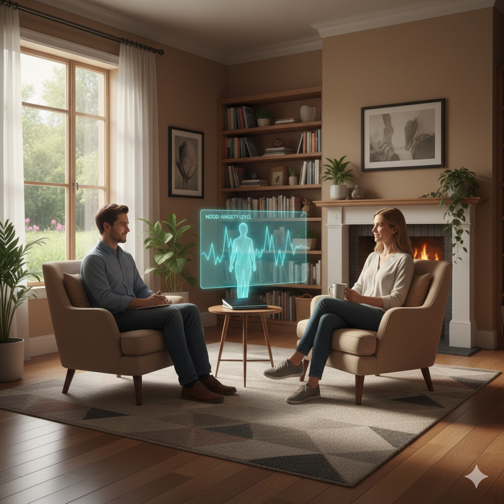 Уютный кабинет терапевта. Пациент делится эмоциями, рядом появляется голографический И