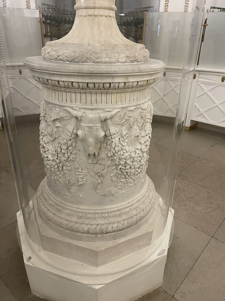 Давайте, пока мы гуляем с вами по Павловску, поговорим о его подробностях. Про внутренне содержание, in general, я вам, вкратце в видео показываю, но иногда бывает необходимо на некоторых деталях особенно заострится. Вот, например, такая ваза… Красивая, но… немного пугающая, правда? Что здесь делает мертвая бычья голова?