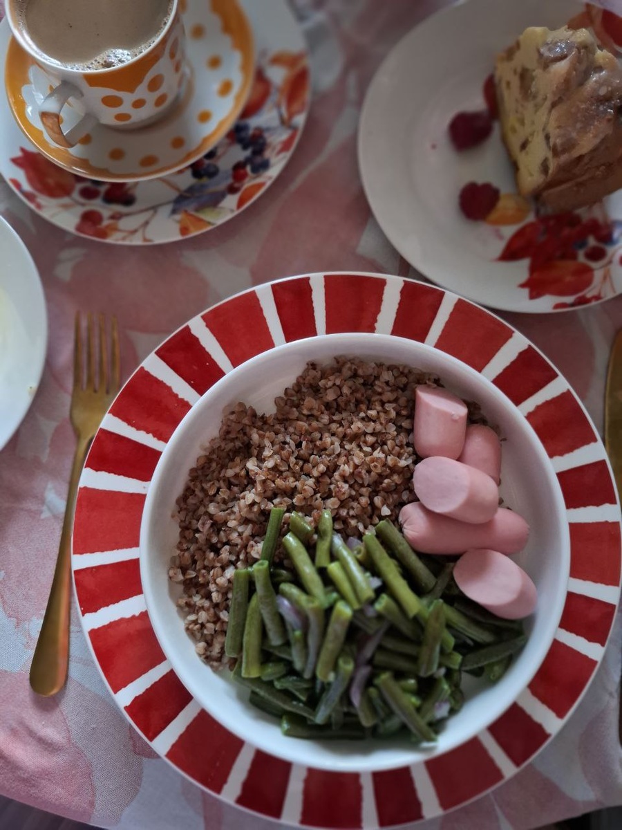Гречка четверга: симфония вкуса и вдохновения Четверо суток недели уже миновали, оставляя за собой следы забот и будничных хлопот. И вот наступил четверг — день необычный, словно театральный акт перед финалом пьесы. Именно в этот день решено было сотворить нечто особенное на утреннем столе. На завтрак была задумка приготовить традиционную гречневую кашу с классической русской добавкой — тушёной капустой да ароматными сосисками. Казалось бы, ничего сложного, но сердце просило перемен, экспериментов и новых ощущений. Гречка варится быстро, уверенно превращаясь из твёрдых зёрнышек в мягкую рассыпчатую массу. Аромат её наполняет кухню уютом и теплом домашнего очага. Тушёная капуста — привычная спутница, но сегодня она решила уступить место другой героине гастрономического спектакля. Стручковая фасоль — изящная дама, свежесть которой дарит блюду легкость и воздушность. Её зелёные линии украшают тарелку, словно тонкая вязь природы, переплетённая с зернами золотой крупы. Сосиски же стали