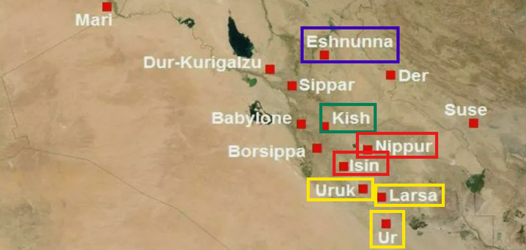 Из-за того, что в каждой провинции история шла своим чередом, сегодня мы с вами будем вынуждены перескакивать из города в город, и так сможем прочувствовать эту раздробленность. Основными сценами театра будут, во-первых, конечно, Ур и Урук, а также Ларса на юге, во-вторых, Исин и Ниппур в центре, в-третьих, Киш к северо-западу, и в-четвёртых, Эшнунна на севере. По ходу дела добавятся и другие, например, Мари далеко на западе, а также Ашшур и Вавилон, из которых вырастут будущие империи.