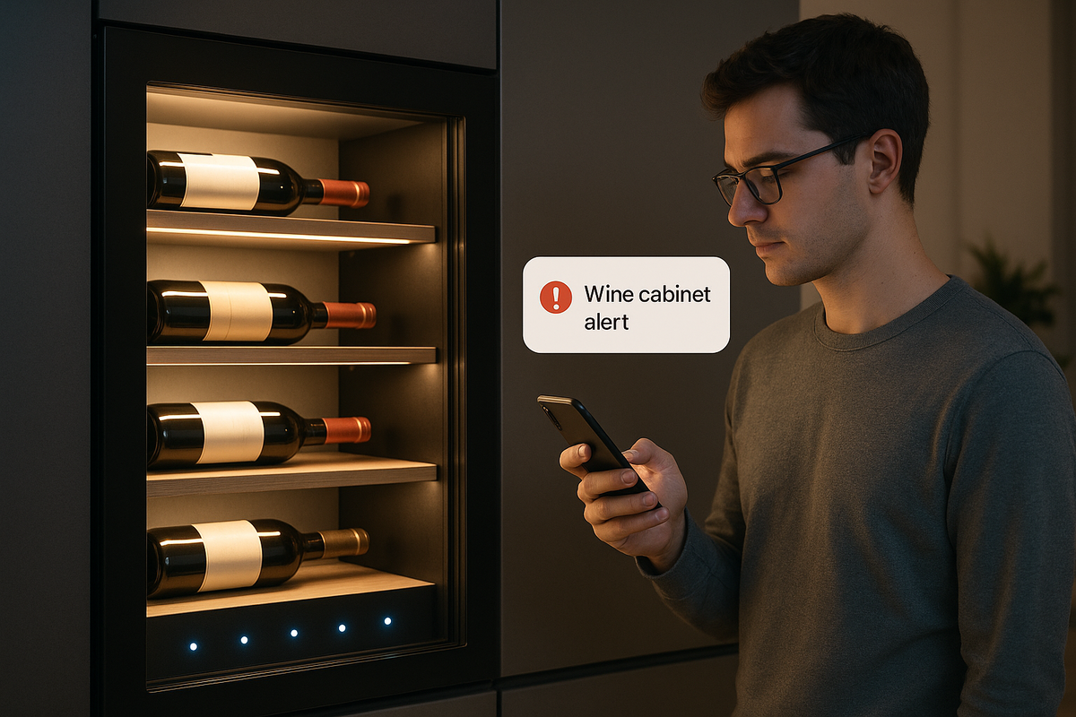 Вино любит правильные условия. Мы подключили датчики температуры и влажности. Теперь если в шкафу становится слишком жарко или сухо, хозяин получает уведомление. Система автоматически включает охлаждение или увлажнение. Это защищает коллекцию и сохраняет вкус напитков.