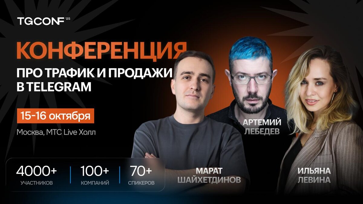Еду в Москву на TgConf 15–16 октября. Крупнейшая в РФ конференция про трафик, продажи и контент в Telegram. Особенно подкупил Артемий Лебедев в качестве хедлайнера и спикерский состав в целом: Марат Шайхетдинов, Михаил Христосенко, Ильяна Левина, Антон Попов (Yandex), Татьяна Бибик, Кирилл Сибиряк, Евгений Лашков — и ещё 60+ экспертов по Telegram Ads, маркетингу, контенту, AI и трафику. Второй момент – это 4000+ участников и организованный нетворкинг. Норм возможность найти партнёров/клиентов. Особенно вот эта история меня вдохновила. Хочу так же)) Третий – закрытое Afterparty, которое обещает быть легендарным: шоу-программа, безлимитный бар и концерт от супер-звезды. Такое мы любим :)) Если тоже планируете идти, ловите –10% по промокоду tgconfinfo15 на все тарифы. 🎟 Билеты лучше брать ДО повышения цен
