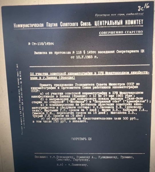 Ещё одна находка в архивах о Константине Симонове. В РГАНИ нашлись материалы о том, как в нашей стране в 1965 году готовились к кинофестивалю в Каннах. Накануне в Москве побывал один из организаторов этого кинофорума Фавр Ле Брэ. Он сообщил руководству нашего Госкино, что французы хотят видеть в составе жюри Каннского кинофестиваля Константина Симонова (а у нас накануне вышел в прокат фильм Столпера «Живые и мёртвые», снятый по мотивам романа писателя). Советское киношное начальство не возражало, но, воспользовавшись случаем, понавключало в советскую делегацию уйму разного народа и отправило документы, включая анкеты, в том числе и на Симонова, в самые высокие инстанции. Вопрос рассматривался на Секретариате ЦК КПСС. Согласие давал главный партийный идеолог Михаил Суслов. Однако Симонов захотел отправиться во Францию непременно со своей супругой – искусствоведом Ларисой Жадовой. Чиновникам пришлось срочно обращаться в ЦК КПСС уже за разрешением и для Жадовой. В пояснительном письме он