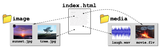 В языке HTML используются команды особого типа — тэги (англ, tag — метка, ярлык). Существуют тэги для выделения заголовков, абзацев, вставки таблиц. С помощью тэгов в веб-страницы добавляют рисунки, звуки, анимацию, видео, которые хранятся на сервере в виде отдельных файлов. Часто для дополнительных данных на сайте создаются специальные каталоги, например, рисунки могут быть размещены в каталоге images, звуковые и видеофайлы — в каталоге media.